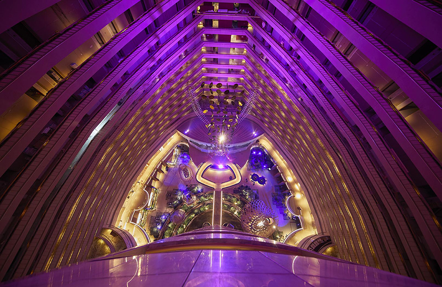 The experience continues with an overall aerial view from the upper guest corridors, where the transition of the day to night time ambience of the atrium, and the evening night show.